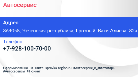 Автосервис по адресу 364058, Чеченская республика, Грозный, Вахи Алиева, 82а в дальнейшем Организация, размещена в следующих категориях:
