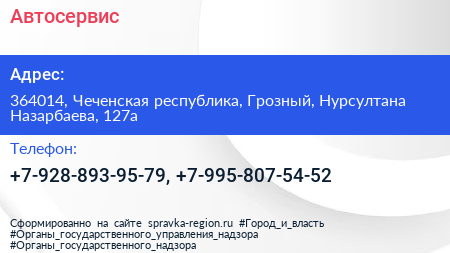 Автосервис по адресу 364014, Чеченская республика, Грозный, Нурсултана Назарбаева, 127а в дальнейшем Организация, размещена в следующих категориях: