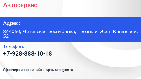 Автосервис по адресу 364060, Чеченская республика, Грозный, Эсет Кишиевой, 52 в дальнейшем Организация, размещена в следующих категориях: