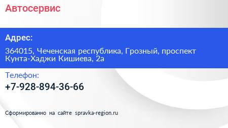 Автосервис по адресу 364015, Чеченская республика, Грозный, проспект Кунта-Хаджи Кишиева, 2а в дальнейшем Организация, размещена в следующих категориях: