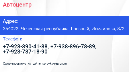 Автоцентр по адресу 364022, Чеченская республика, Грозный, Исмаилова, 8/2 в дальнейшем Организация, размещена в следующих категориях: