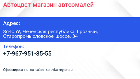 Автоцвет, магазин автоэмалей по адресу 364059, Чеченская республика, Грозный, Старопромысловское шоссе, 34 в дальнейшем Организация, размещена в следующих категориях: