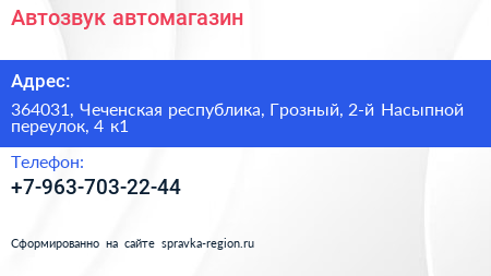 Автозвук, автомагазин по адресу 364031, Чеченская республика, Грозный, 2-й Насыпной переулок, 4 к1 в дальнейшем Организация, размещена в следующих категориях: