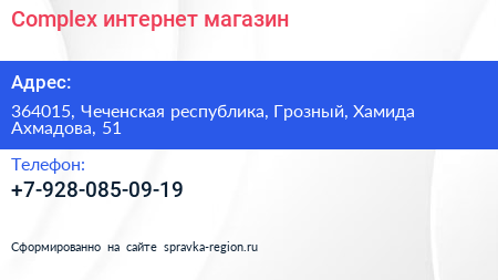 Complex, интернет-магазин по адресу 364015, Чеченская республика, Грозный, Хамида Ахмадова, 51 в дальнейшем Организация, размещена в следующих категориях: