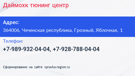 Даймохк, тюнинг-центр по адресу 364006, Чеченская республика, Грозный, Яблочная, 1 в дальнейшем Организация, размещена в следующих категориях: