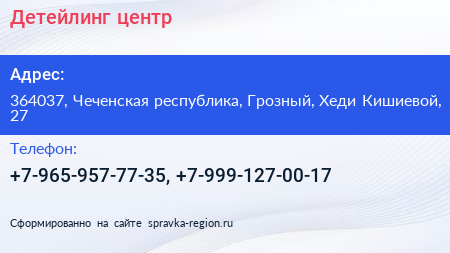 Детейлинг-центр по адресу 364037, Чеченская республика, Грозный, Хеди Кишиевой, 27 в дальнейшем Организация, размещена в следующих категориях: