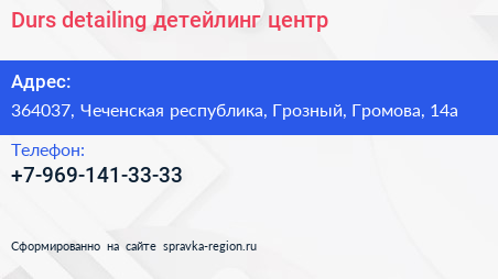 Durs detailing, детейлинг-центр по адресу 364037, Чеченская республика, Грозный, Громова, 14а в дальнейшем Организация, размещена в следующих категориях: