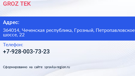 GROZ TEK по адресу 364014, Чеченская республика, Грозный, Петропавловское шоссе, 22 в дальнейшем Организация, размещена в следующих категориях: