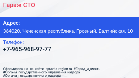 Гараж, СТО по адресу 364020, Чеченская республика, Грозный, Балтийская, 10 в дальнейшем Организация, размещена в следующих категориях: