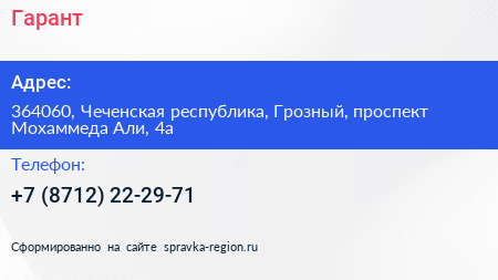 Гарант по адресу 364060, Чеченская республика, Грозный, проспект Мохаммеда Али, 4а в дальнейшем Организация, размещена в следующих категориях: