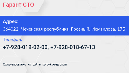 Гарант, СТО по адресу 364022, Чеченская республика, Грозный, Исмаилова, 17Б в дальнейшем Организация, размещена в следующих категориях: