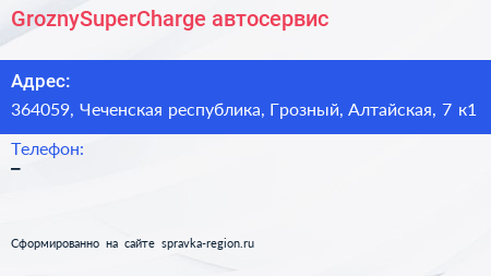 GroznySuperCharge, автосервис по адресу 364059, Чеченская республика, Грозный, Алтайская, 7 к1 в дальнейшем Организация, размещена в следующих категориях: