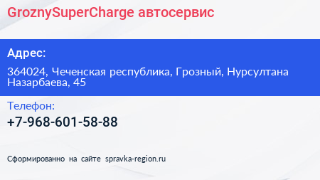 GroznySuperCharge, автосервис по адресу 364024, Чеченская республика, Грозный, Нурсултана Назарбаева, 45 в дальнейшем Организация, размещена в следующих категориях: