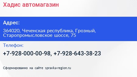 Хадис, автомагазин по адресу 364020, Чеченская республика, Грозный, Старопромысловское шоссе, 75 в дальнейшем Организация, размещена в следующих категориях: