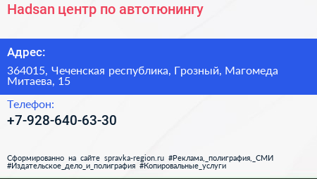Hadsan, центр по автотюнингу по адресу 364015, Чеченская республика, Грозный, Магомеда Митаева, 15 в дальнейшем Организация, размещена в следующих категориях: