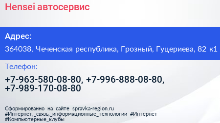 Hensei, автосервис по адресу 364038, Чеченская республика, Грозный, Гуцериева, 82 к1 в дальнейшем Организация, размещена в следующих категориях: