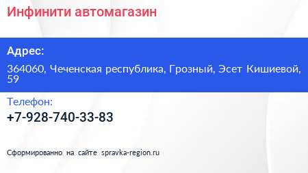 Инфинити, автомагазин по адресу 364060, Чеченская республика, Грозный, Эсет Кишиевой, 59 в дальнейшем Организация, размещена в следующих категориях: