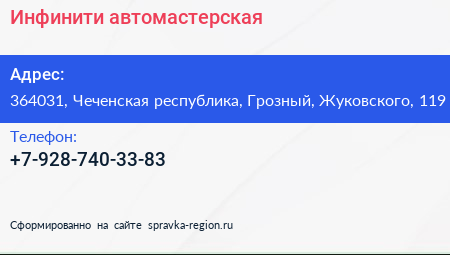 Инфинити, автомастерская по адресу 364031, Чеченская республика, Грозный, Жуковского, 119 в дальнейшем Организация, размещена в следующих категориях: