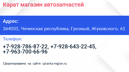 Карат, магазин автозапчастей по адресу 364031, Чеченская республика, Грозный, Жуковского, 61 в дальнейшем Организация, размещена в следующих категориях: