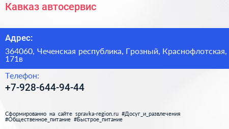 Кавказ, автосервис по адресу 364060, Чеченская республика, Грозный, Краснофлотская, 171в в дальнейшем Организация, размещена в следующих категориях: