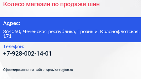 Колесо, магазин по продаже шин по адресу 364060, Чеченская республика, Грозный, Краснофлотская, 171 в дальнейшем Организация, размещена в следующих категориях: