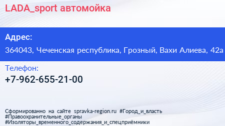 LADA_sport, автомойка по адресу 364043, Чеченская республика, Грозный, Вахи Алиева, 42а в дальнейшем Организация, размещена в следующих категориях: