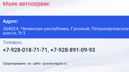 Маяк, автосервис по адресу 364014, Чеченская республика, Грозный, Петропавловское шоссе, 9/1 в дальнейшем Организация, размещена в следующих категориях: