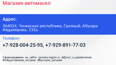Магазин автомасел по адресу 364014, Чеченская республика, Грозный, Абузара Айдамирова, 131а в дальнейшем Организация, размещена в следующих категориях: