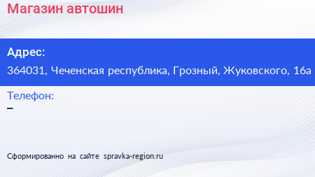 Магазин автошин по адресу 364031, Чеченская республика, Грозный, Жуковского, 16а в дальнейшем Организация, размещена в следующих категориях: