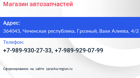 Магазин автозапчастей по адресу 364043, Чеченская республика, Грозный, Вахи Алиева, 4/2 в дальнейшем Организация, размещена в следующих категориях: