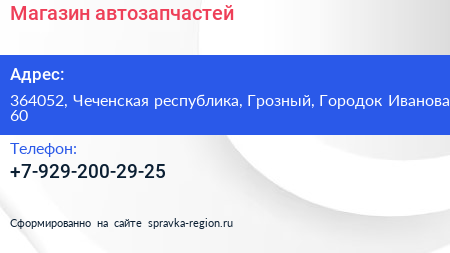 Магазин автозапчастей по адресу 364052, Чеченская республика, Грозный, Городок Иванова, 60 в дальнейшем Организация, размещена в следующих категориях: