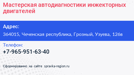 Мастерская автодиагностики инжекторных двигателей по адресу 364015, Чеченская республика, Грозный, Узуева, 126в в дальнейшем Организация, размещена в следующих категориях: