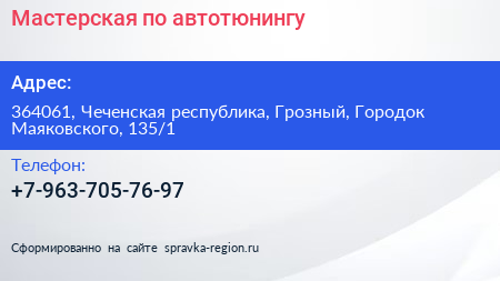 Мастерская по автотюнингу по адресу 364061, Чеченская республика, Грозный, Городок Маяковского, 135/1 в дальнейшем Организация, размещена в следующих категориях: