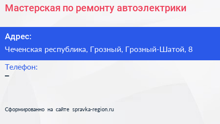 Мастерская по ремонту автоэлектрики по адресу Чеченская республика, Грозный, Грозный-Шатой, 8 в дальнейшем Организация, размещена в следующих категориях: