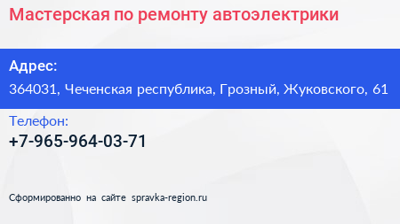 Мастерская по ремонту автоэлектрики по адресу 364031, Чеченская республика, Грозный, Жуковского, 61 в дальнейшем Организация, размещена в следующих категориях: