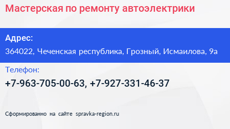 Мастерская по ремонту автоэлектрики по адресу 364022, Чеченская республика, Грозный, Исмаилова, 9а в дальнейшем Организация, размещена в следующих категориях: