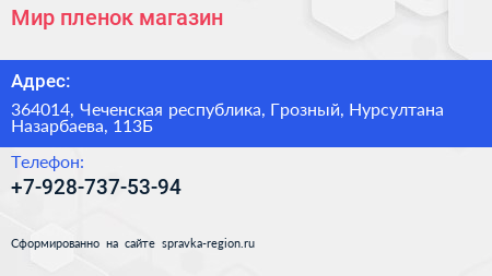 Мир пленок, магазин по адресу 364014, Чеченская республика, Грозный, Нурсултана Назарбаева, 113Б в дальнейшем Организация, размещена в следующих категориях: