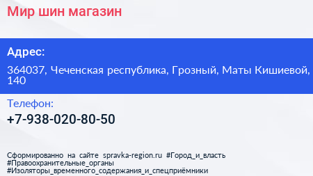 Мир шин, магазин по адресу 364037, Чеченская республика, Грозный, Маты Кишиевой, 140 в дальнейшем Организация, размещена в следующих категориях: