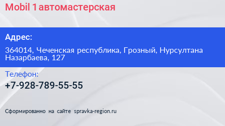 Mobil 1, автомастерская по адресу 364014, Чеченская республика, Грозный, Нурсултана Назарбаева, 127 в дальнейшем Организация, размещена в следующих категориях: