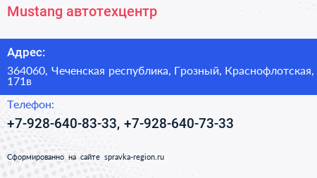 Mustang, автотехцентр по адресу 364060, Чеченская республика, Грозный, Краснофлотская, 171в в дальнейшем Организация, размещена в следующих категориях: