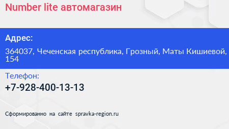 Number lite, автомагазин по адресу 364037, Чеченская республика, Грозный, Маты Кишиевой, 154 в дальнейшем Организация, размещена в следующих категориях: