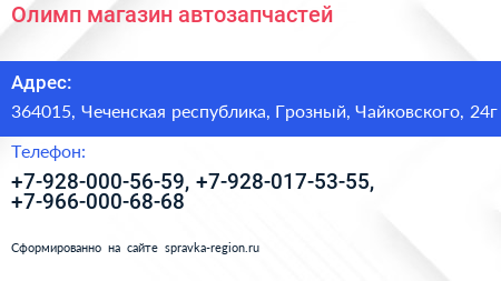 Олимп, магазин автозапчастей по адресу 364015, Чеченская республика, Грозный, Чайковского, 24г в дальнейшем Организация, размещена в следующих категориях: