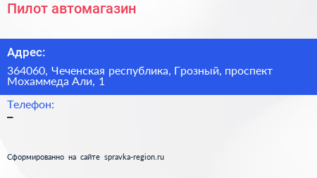 Пилот, автомагазин по адресу 364060, Чеченская республика, Грозный, проспект Мохаммеда Али, 1 в дальнейшем Организация, размещена в следующих категориях:
