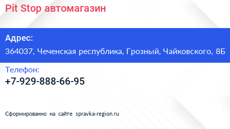 Pit Stop, автомагазин по адресу 364037, Чеченская республика, Грозный, Чайковского, 8Б в дальнейшем Организация, размещена в следующих категориях: