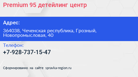 Premium.95, детейлинг-центр по адресу 364038, Чеченская республика, Грозный, Новопромысловая, 40 в дальнейшем Организация, размещена в следующих категориях: