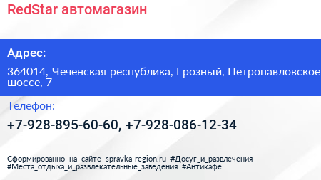 RedStar, автомагазин по адресу 364014, Чеченская республика, Грозный, Петропавловское шоссе, 7 в дальнейшем Организация, размещена в следующих категориях: