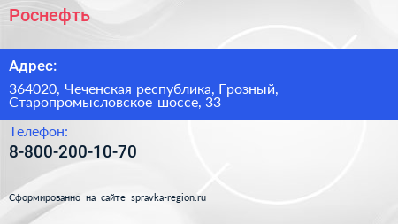 Роснефть по адресу 364020, Чеченская республика, Грозный, Старопромысловское шоссе, 33 в дальнейшем Организация, размещена в следующих категориях: