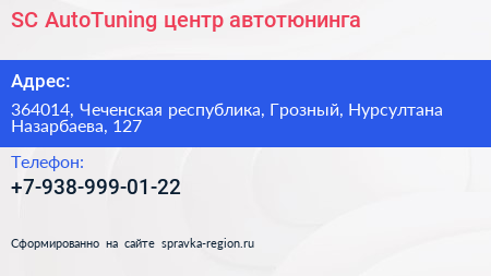 SC AutoTuning, центр автотюнинга по адресу 364014, Чеченская республика, Грозный, Нурсултана Назарбаева, 127 в дальнейшем Организация, размещена в следующих категориях:
