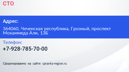 СТО по адресу 364060, Чеченская республика, Грозный, проспект Мохаммеда Али, 13Б в дальнейшем Организация, размещена в следующих категориях: