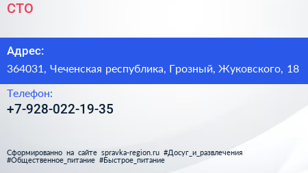 СТО по адресу 364031, Чеченская республика, Грозный, Жуковского, 18 в дальнейшем Организация, размещена в следующих категориях: